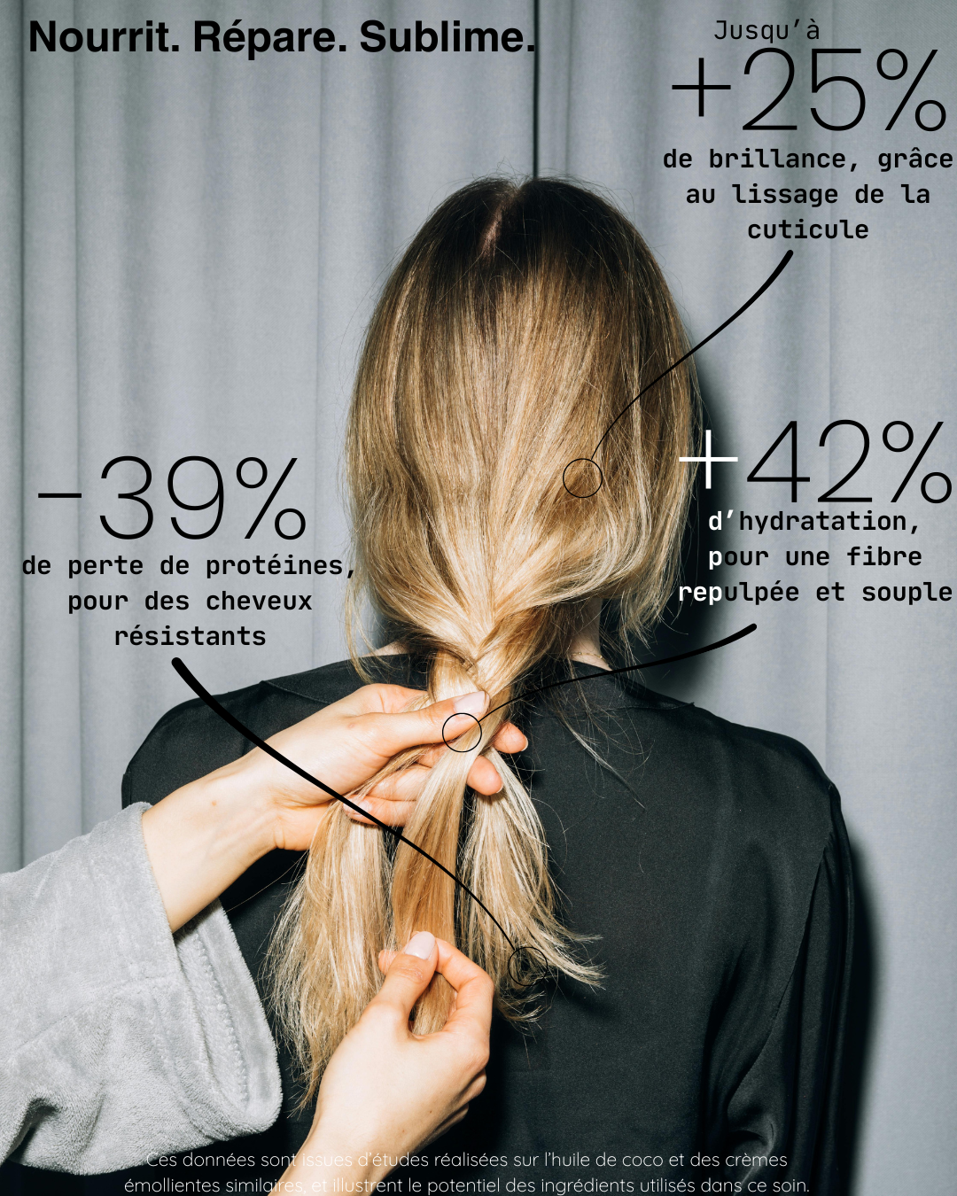 L’huile de coco, qui possède une affinité naturelle avec la kératine, renforce la fibre en limitant la perte de protéines lors du lavage ou du coiffage. Son action pénétrante permet une réparation visible et une fibre plus résistante au quotidien. Les triglycérides d’origine végétale enveloppent le cheveu pour améliorer sa cohésion et augmenter sa brillance, tandis que le sodium lactate contribue à maintenir l’intégrité de la fibre en réduisant significativement la déshydratation. Ensemble, ces actifs soutiennent un cheveu plus fort, moins poreux et moins sujet à la casse.